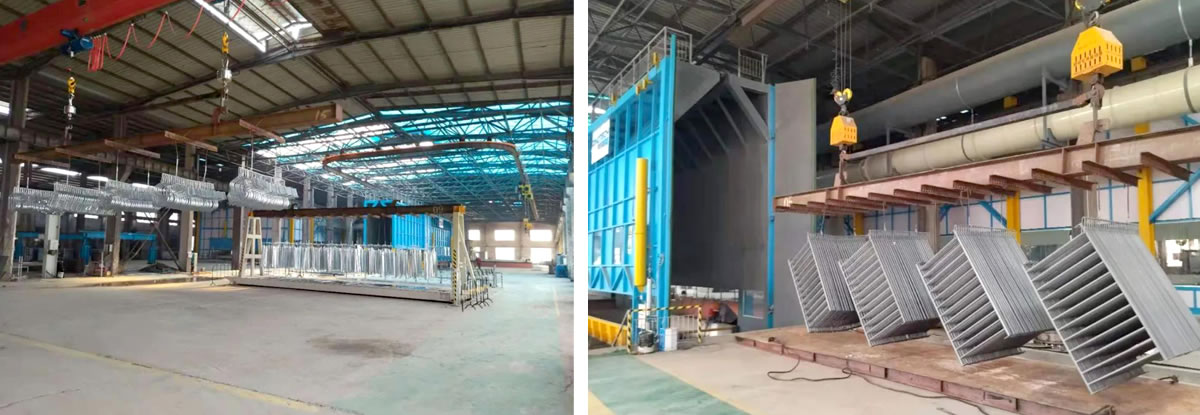 東營東宸農牧熱鍍鋅生產線的生產方式為吊鍍。該產線在原有舊廠房基礎上設計、制作、安裝、交付。鋅鍋尺寸為:長9.5米,寬1.8,深2.8米,設計年產能為3萬噸。鋅鍋生產節拍設計為6-10次/小時。該生產線為U型式布局,鍍鋅階段為端進端出式,物流通暢,生產效率高。