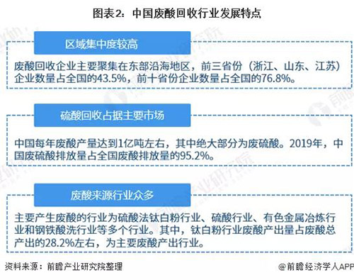 По состоянию на март 2020 года в Китае насчитывается 177 предприятий, связанных с утилизацией отходов кислоты, из которых три провинции Чжэцзян, Шаньдун и Цзянсу занимают первые три места по количеству предприятий по утилизации отходов кислоты, 30, 24 и 23 соответственно.