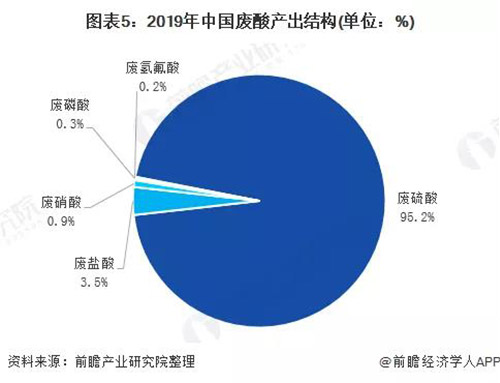 Основными отраслями, производящими отработанные кислоты, являются производство титанового порошка методом сульфата, производство серной кислоты, металлургическая промышленность цветных металлов и металлургическая промышленность. В 2019 году объем производства отработанной кислоты в титановой порошковой промышленности составил около 26,75 млн. тонн, что составляет 28,2% от общего объема производства отработанной кислоты; Производство отработанной кислоты в цветной металлургии составляет около 11,63 млн. тонн, что составляет 12,3% от общего объема производства отработанной кислоты.
